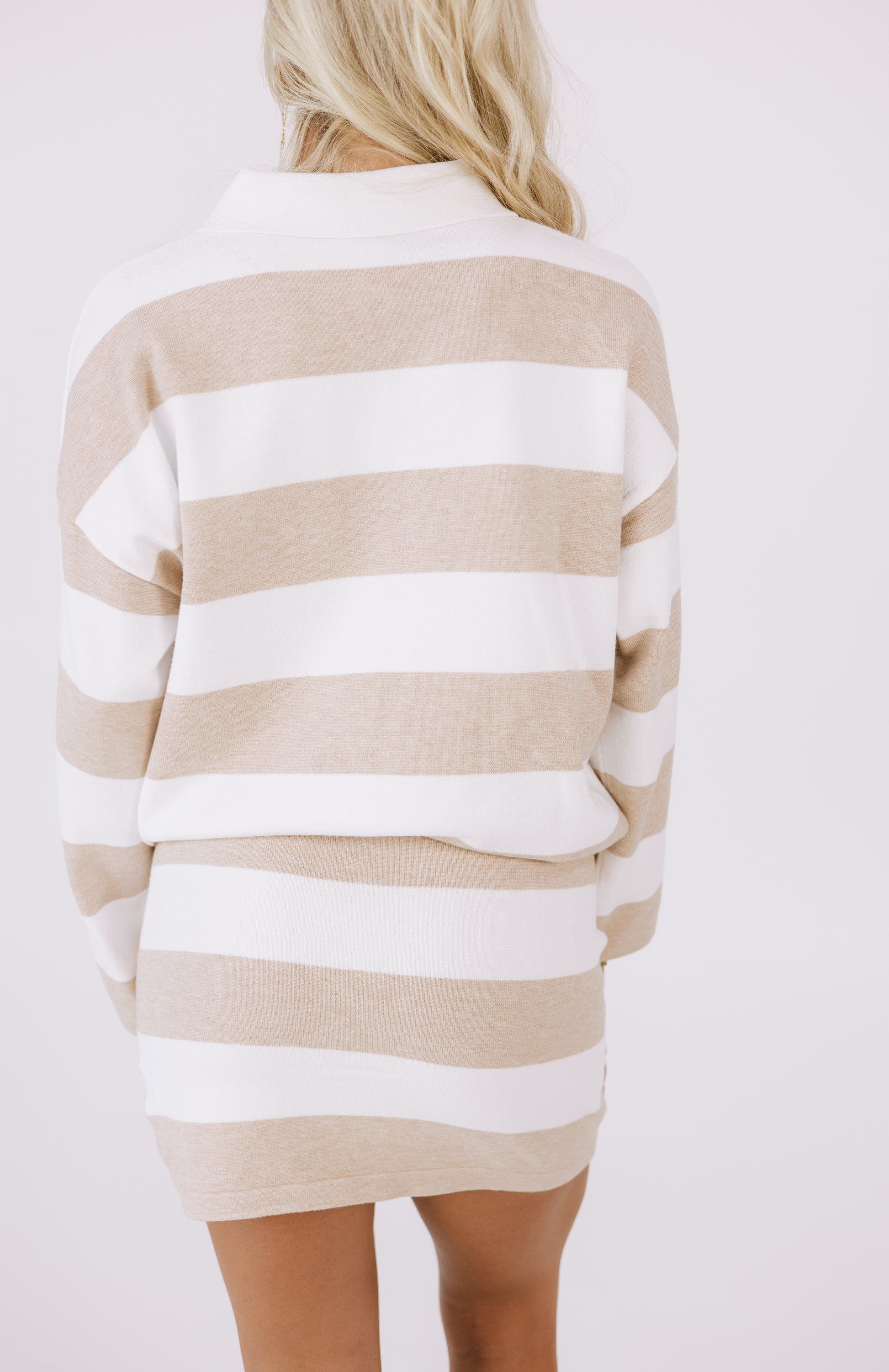 The Almond Latte Set features a soft knit collared top with wide stripes and a matching mini skirt for an effortlessly chic look. Perfect for brunch, travel, or a day out, this neutral striped set brings comfort and style together.