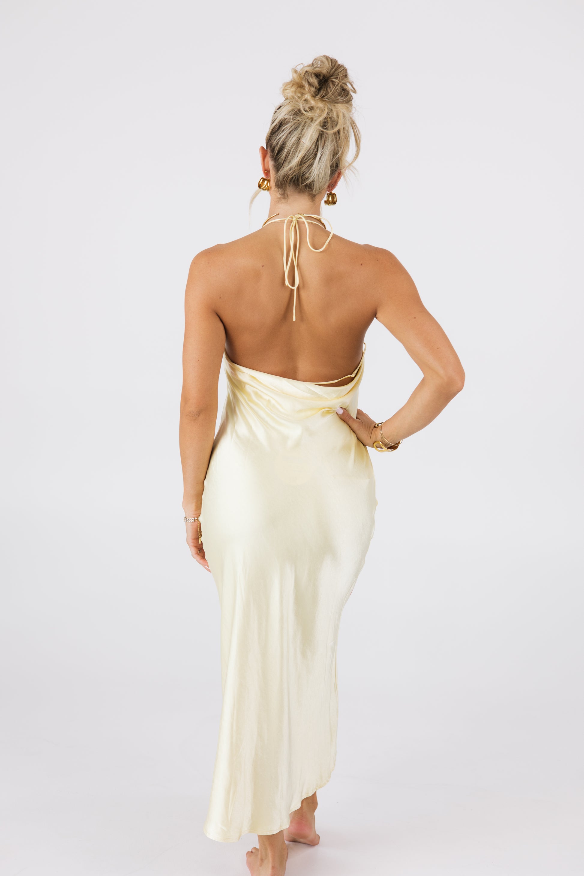 Soft, effortless, and sun-kissed — a silk maxi with delicate floral details and a flattering halter neckline, perfect for golden hour moments, garden parties, or coastal dinners.