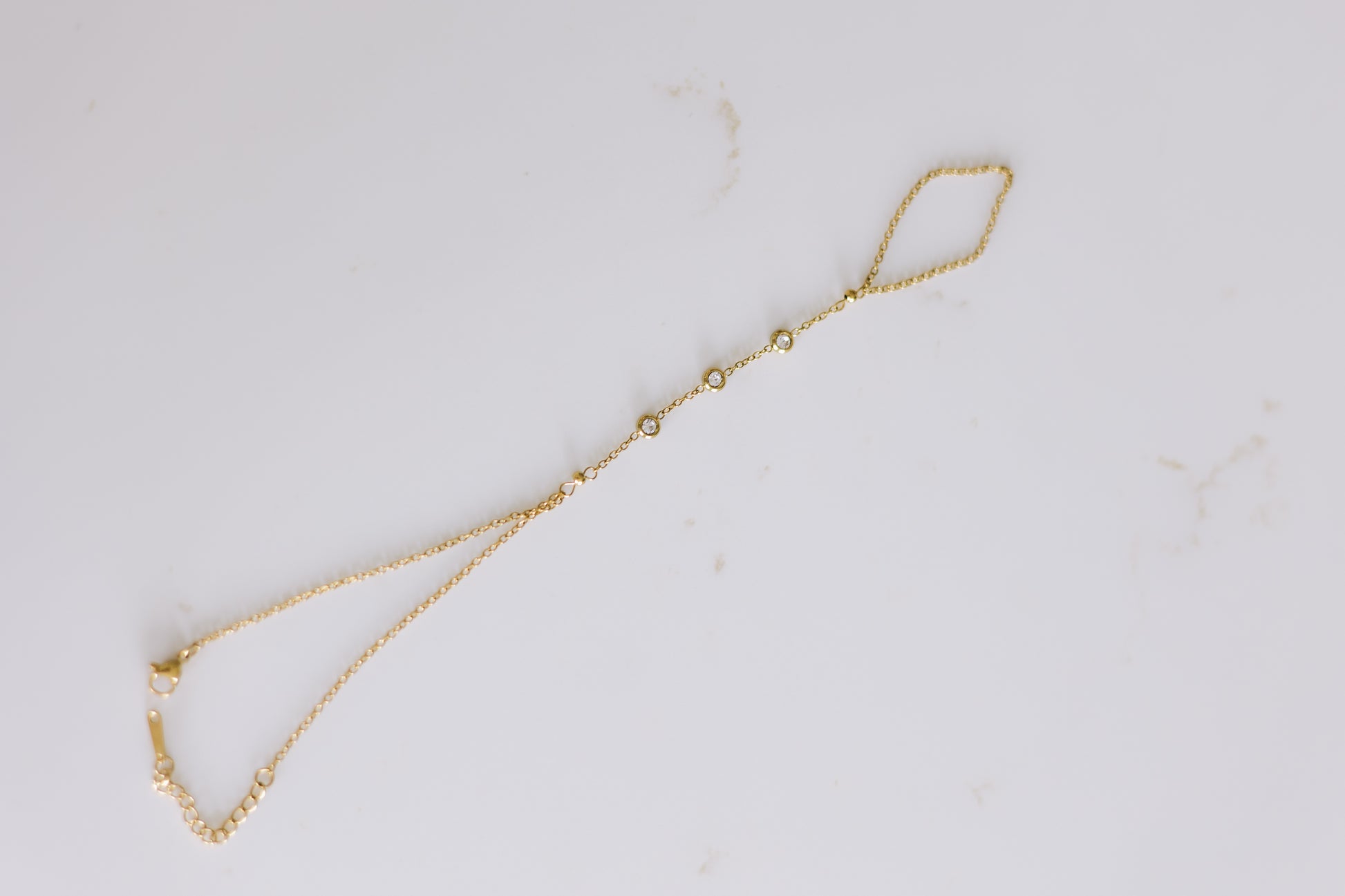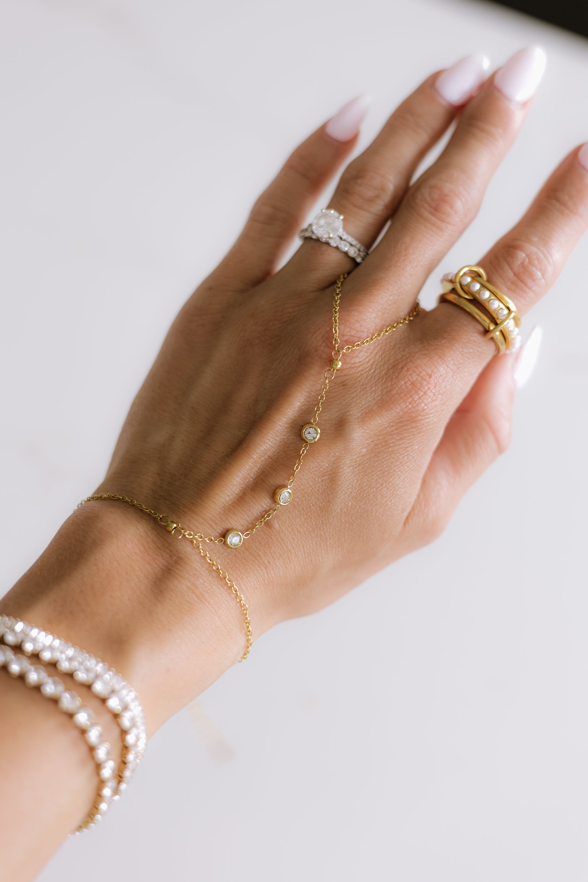 Delicate, refined, and effortlessly unique. The Cleo Hand Chain drapes elegantly across the wrist and finger, adding a subtle shimmer that feels both minimal and special. The perfect finishing touch for golden hour or a night out.