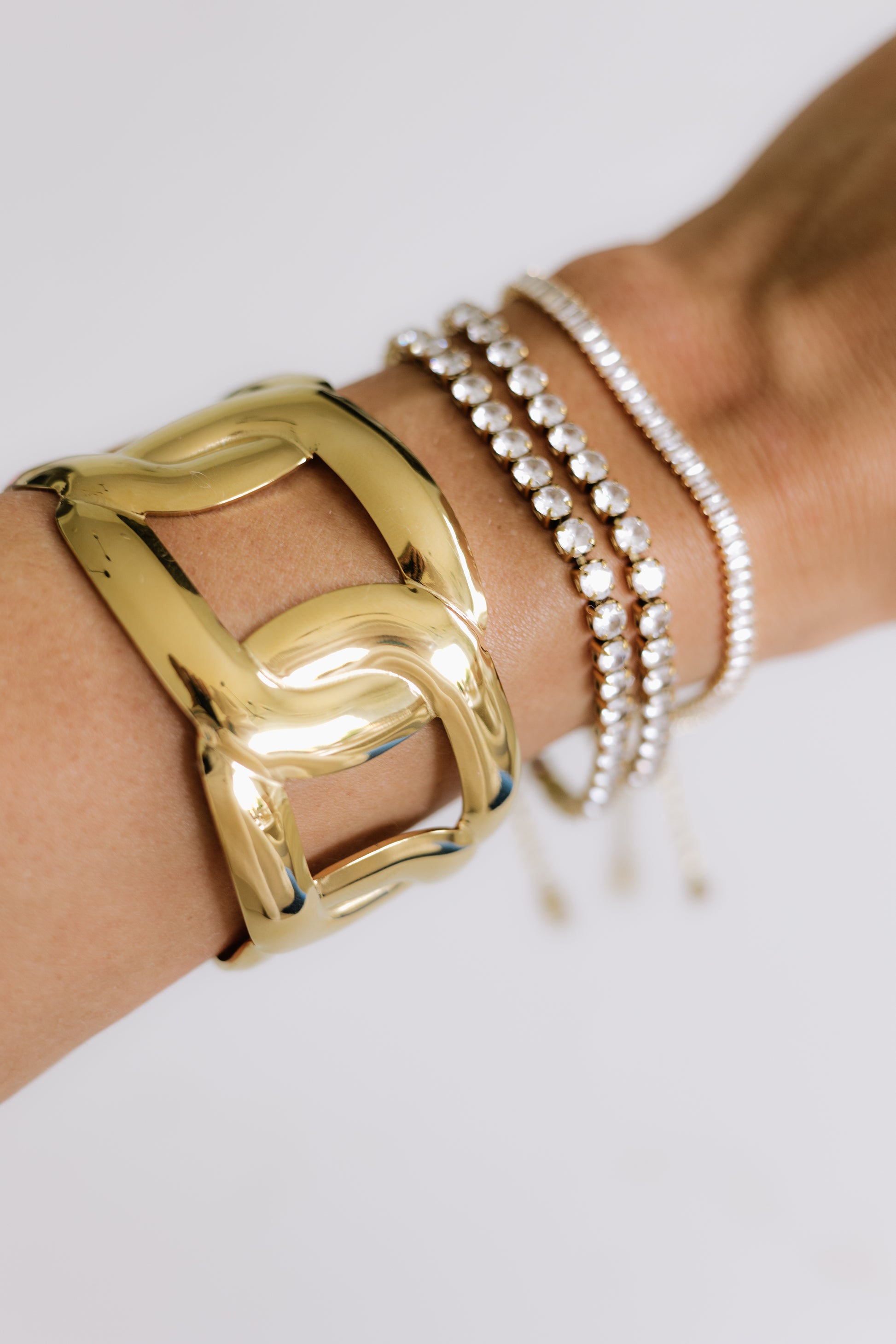 A bold, sculpted bangle with a fluid gold finish. The Golden Tide Cuff is made to be worn on the wrist or styled higher as an arm cuff — striking, minimal, and effortlessly refined.