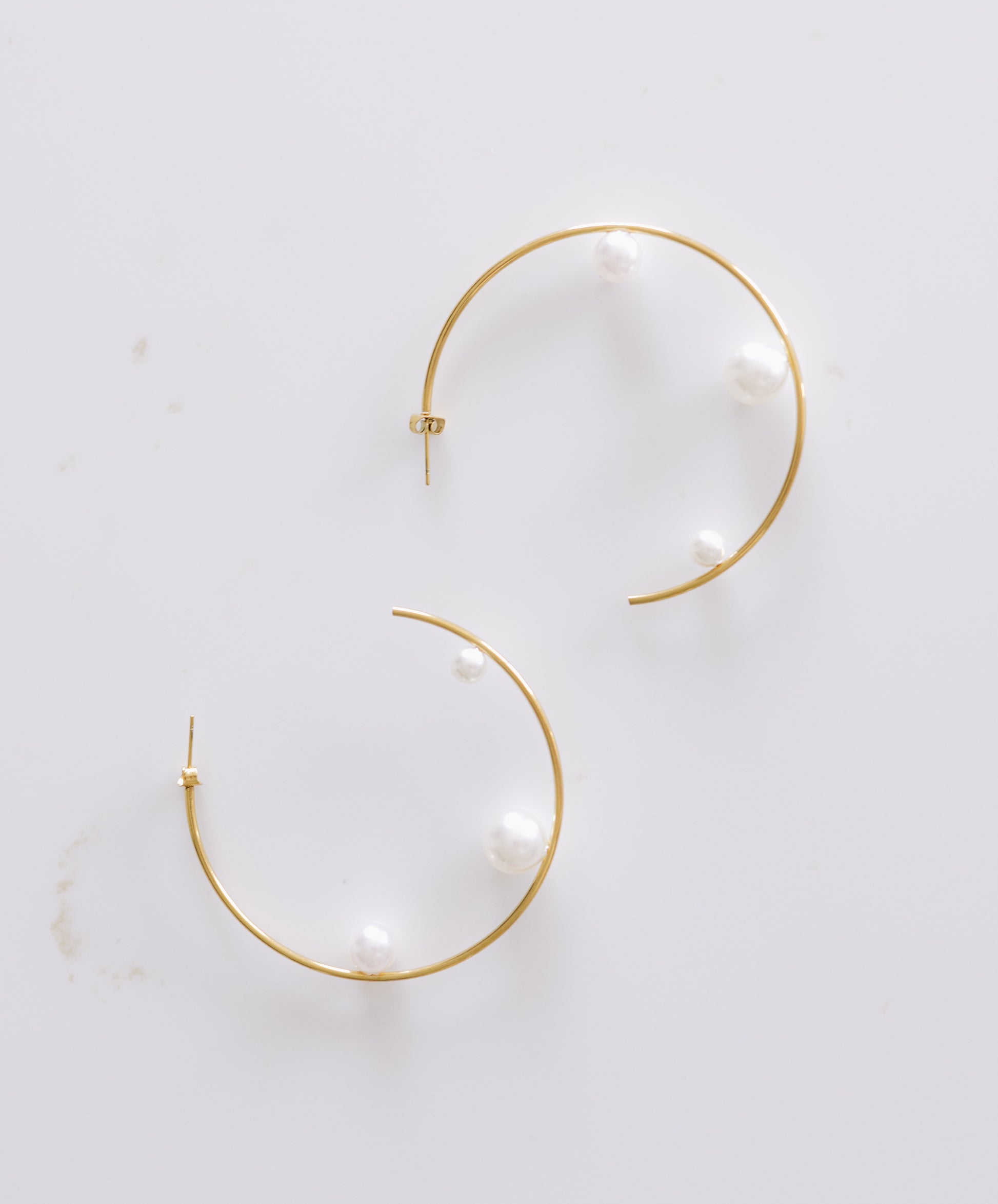 Pretty pearls meet classic gold in these lightweight statement hoops. Easy to wear, fun to style, and made to shine all season long.